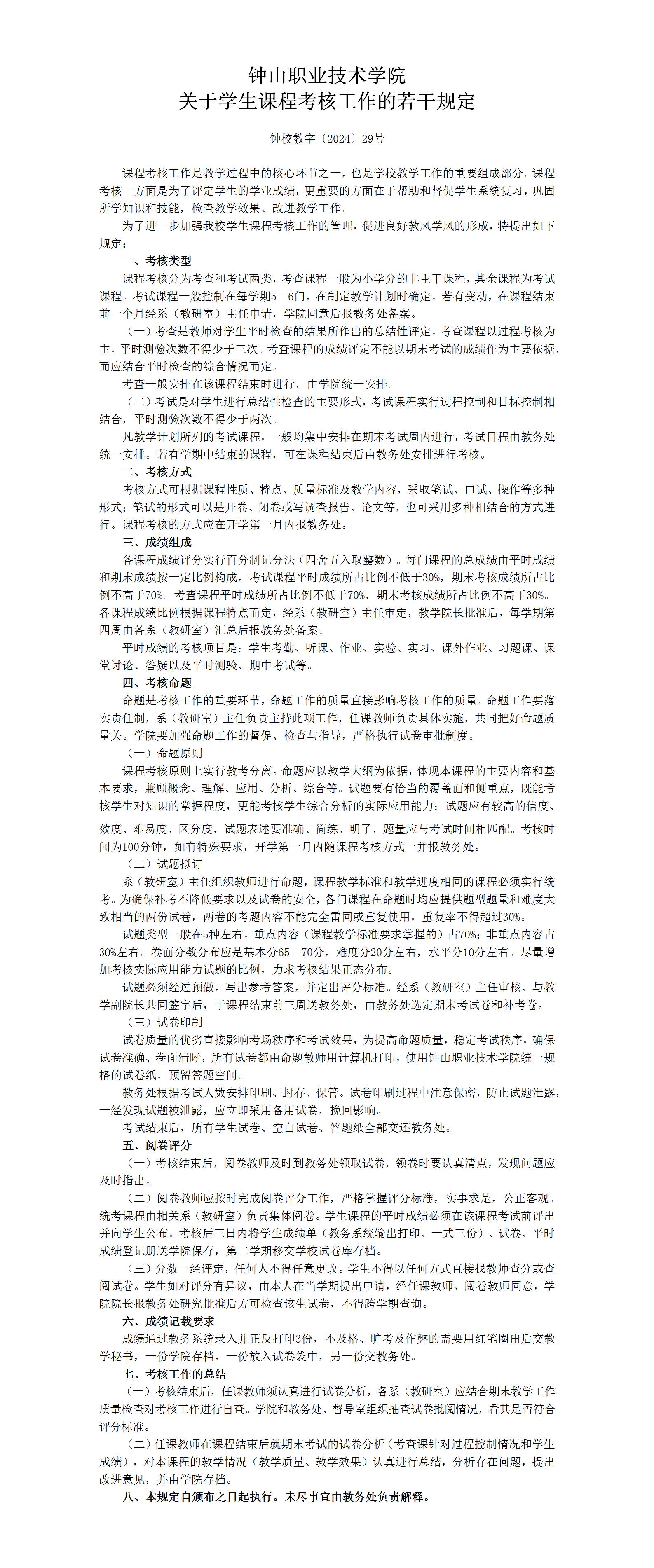 钟山职业技术学院关于学生课程考核工作的若干规定