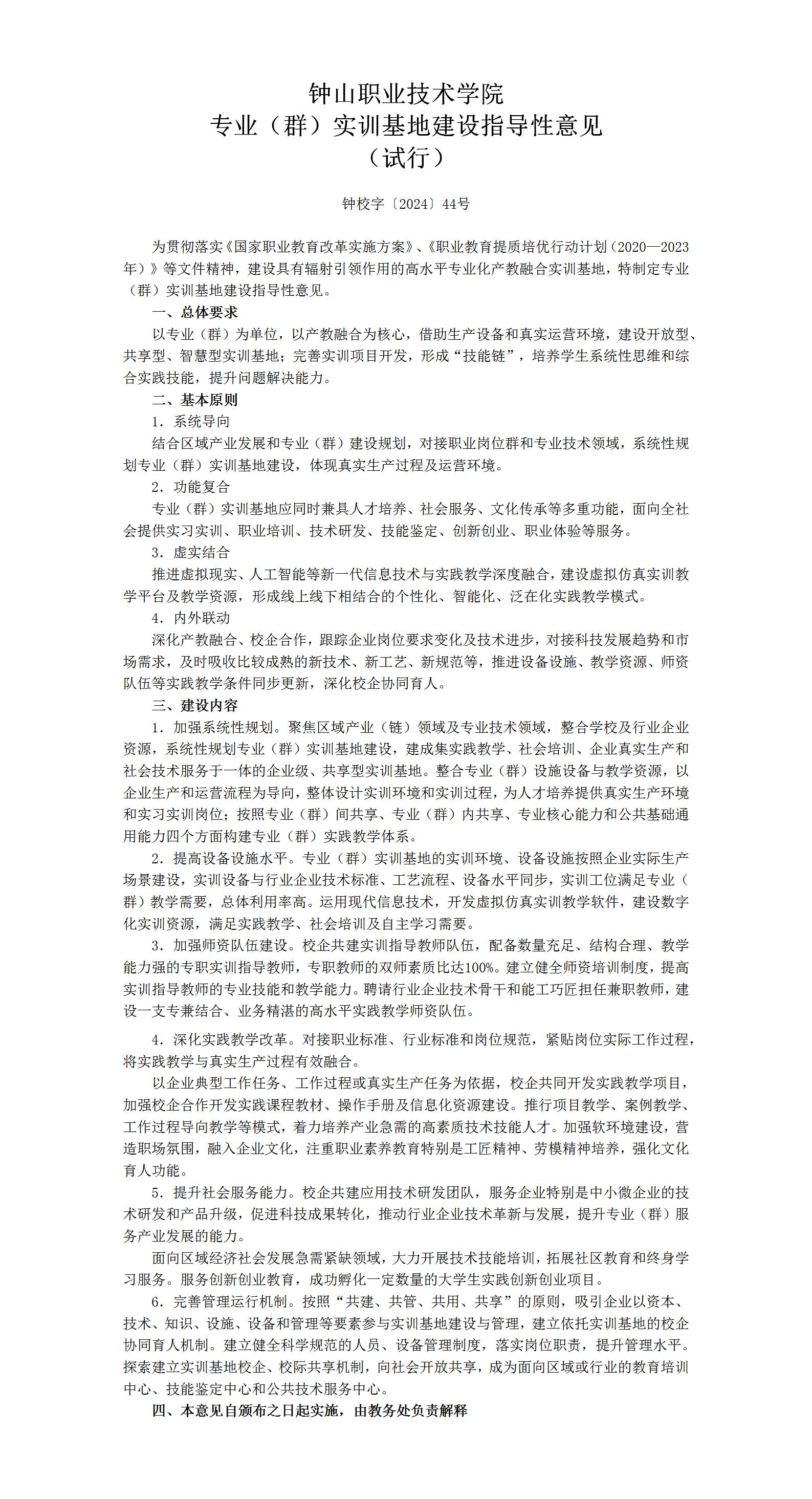 钟山职业技术学院专业(群)实训基地建设指导性意见(试行)