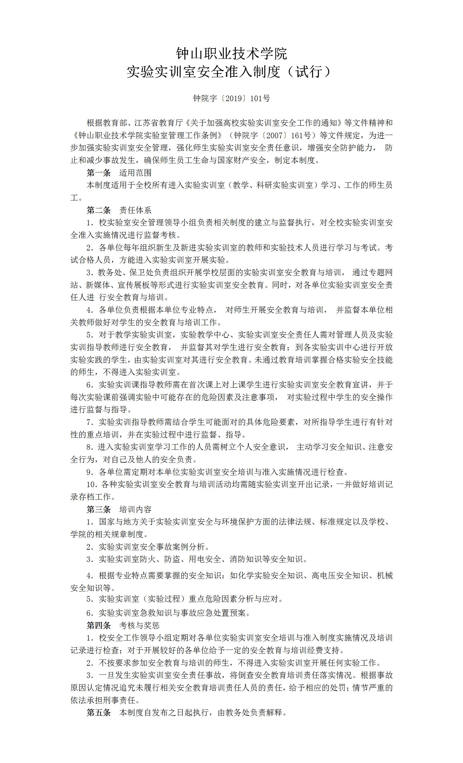 钟山职业技术学院实验实训室安全准入制度(试行)